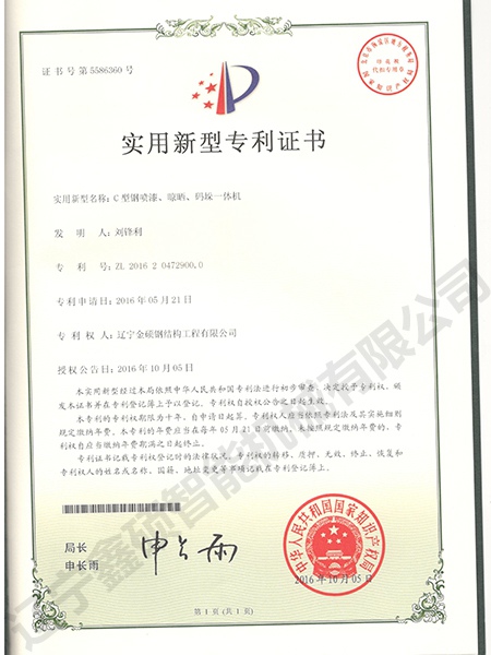 Certificate of utility model for C-beam painting, drying and palletizing integrated machine